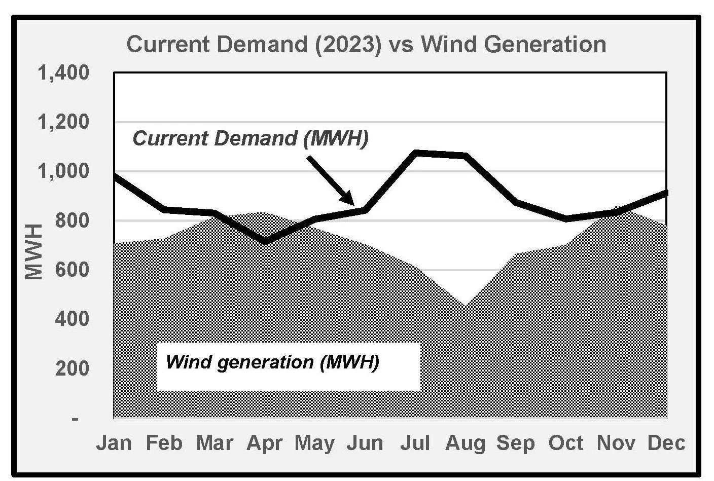Wind generation peaks in winter; mild summer breezes are an unfortunate reality, since summer is when FIEC has peak demand, creating a gap between FIEC’s energy needs and FIW’s generation.